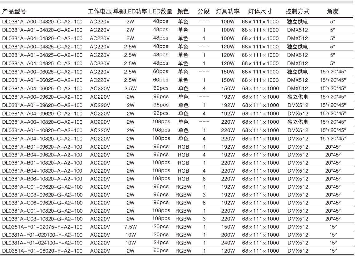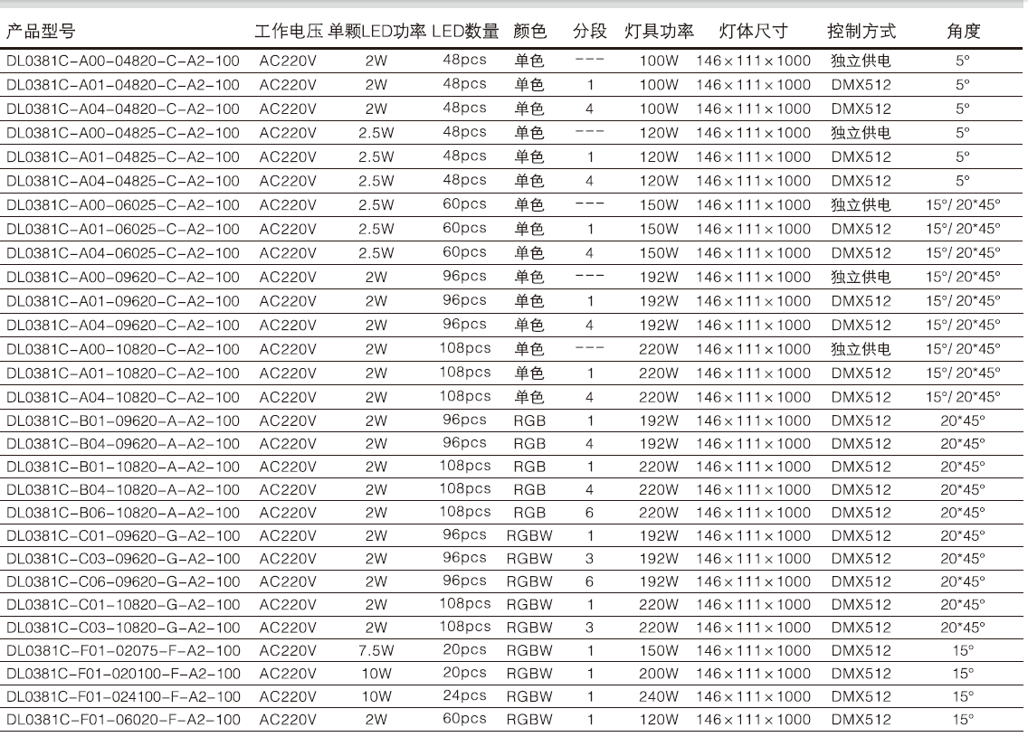 主選配光角度:5°、15°、20*45°。 -
