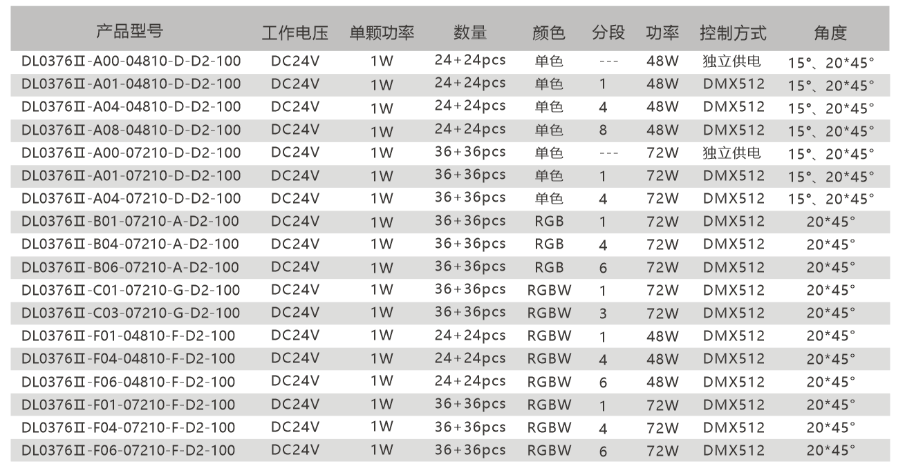 >> 配光選擇:可選配光角度:7°、10°、15°、20°、30°、45°、60°、20*40°、10*50°,