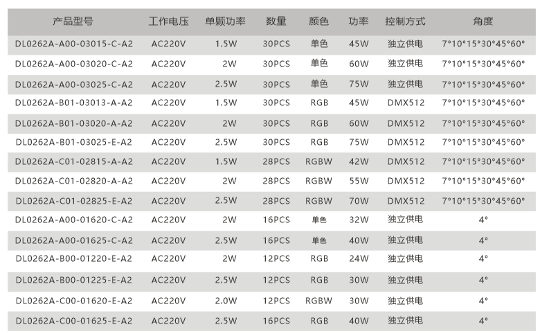 ◆ 光束角配光可選:4° 7°10°15°30°45°60°